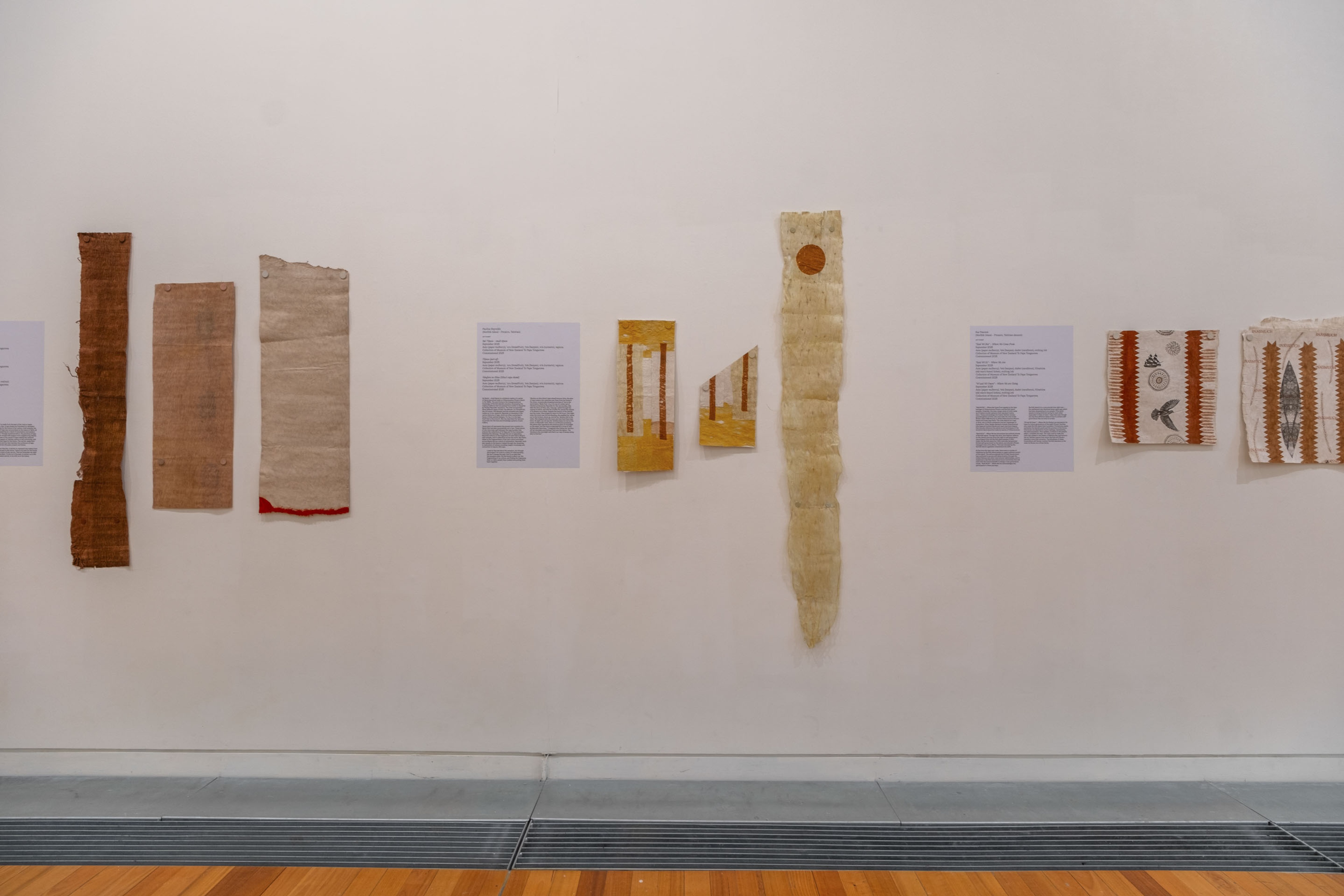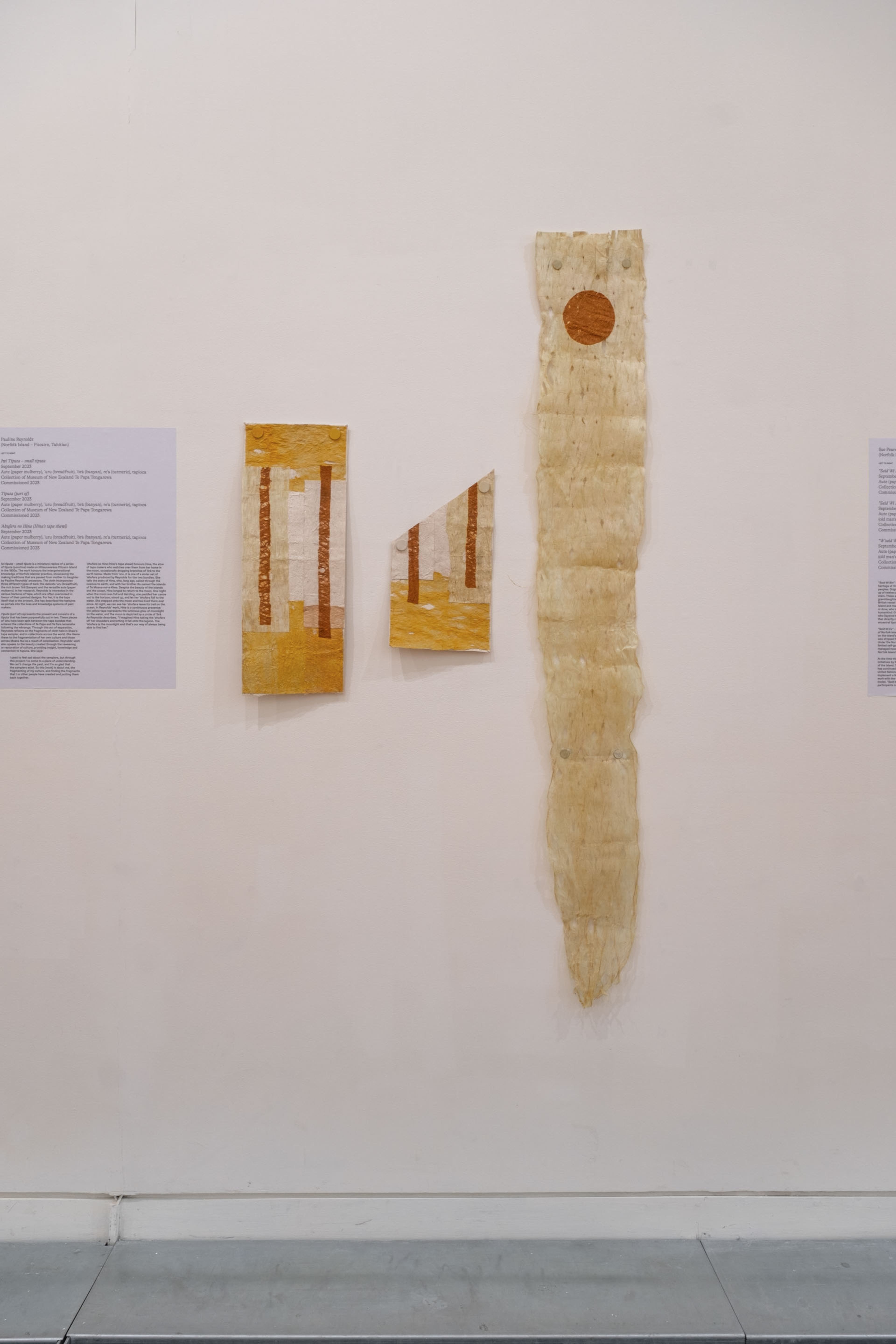 Pauline Reynolds, Te hei no Hina, 2024, woven and plaited ’ōrā (banyan); and My Grandmother is a Tīputa, 2022, aute (paper mulberry), ’uru (breadfruit), ’ōrā tapa dyed with turmeric and nono. Courtesy of the artist. Installation view, Hina Sings, Vaiei Tupuna, Te Pātaka Toi Adam Art Gallery, Te Herenga Waka—Victoria University of Wellington, 2024. Photo: Ted Whitaker.