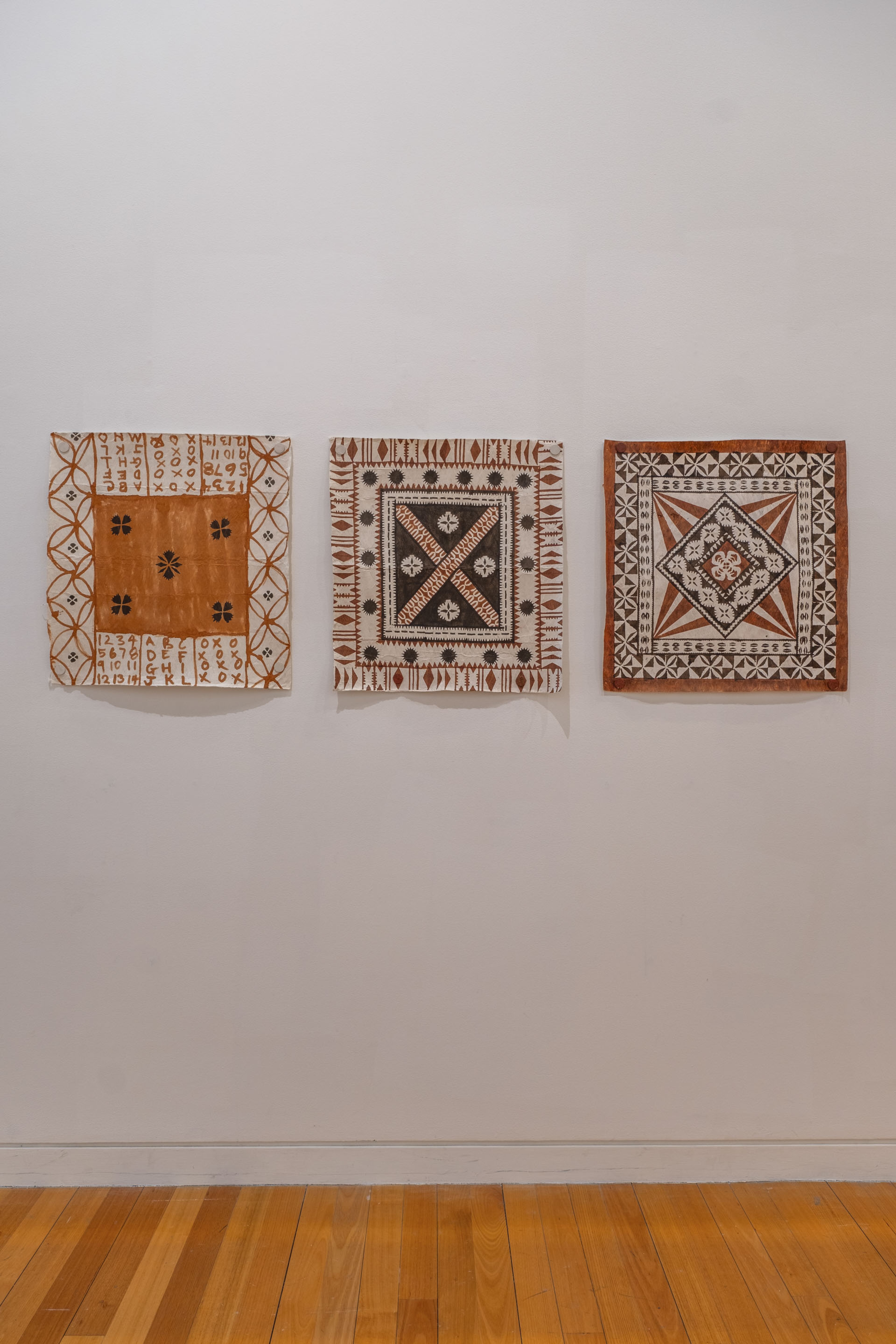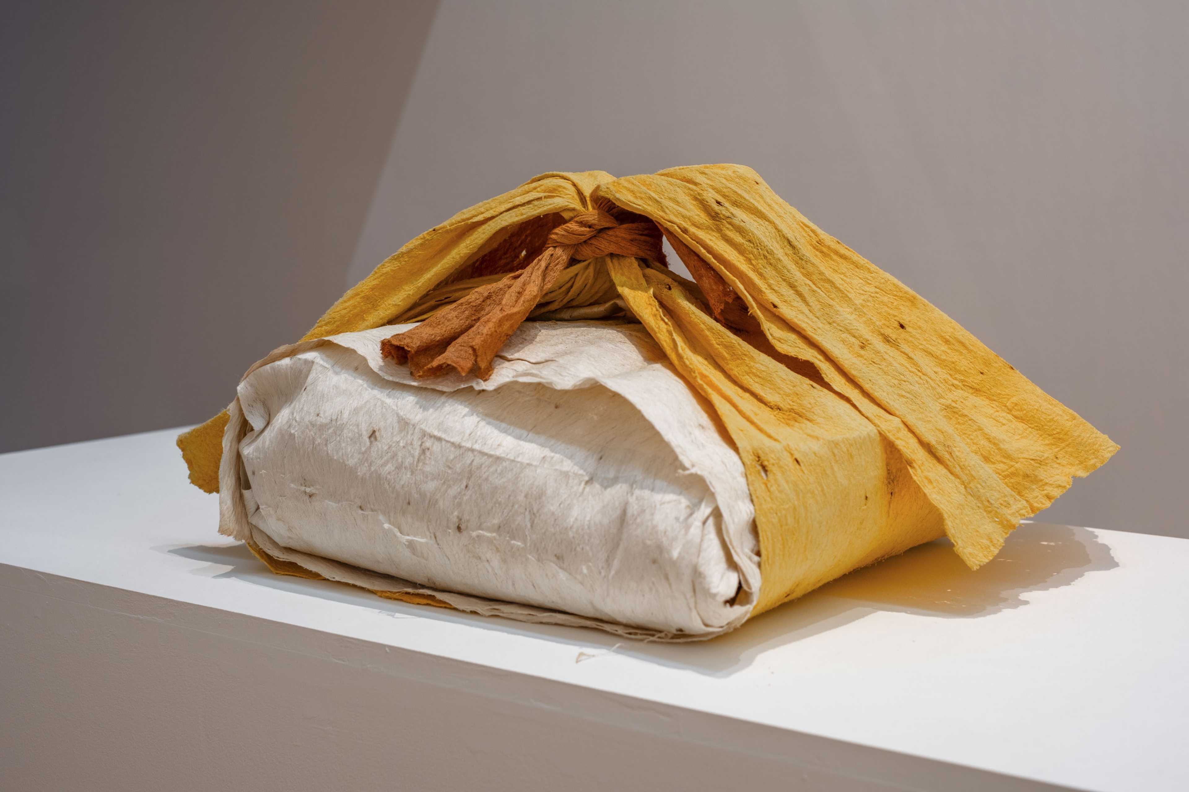 Sulieti Fieme’a Burrows, Tui Emma Gillies, Sarah Vaki, Tutana Tetuanui-Peters, Bundle wrap, 2023, ngatu (Tongan tapa), a’eu pipi (perfumed Marquesan tapa). Collection of Museum of New Zealand Te Papa Tongarewa. Commissioned 2023. Installation view, ’Ahu: Ngā Wairua o Hina, Vaiei Tupuna, Te Pātaka Toi Adam Art Gallery, Te Herenga Waka—Victoria University of Wellington, 2024. Photo: Ted Whitaker.