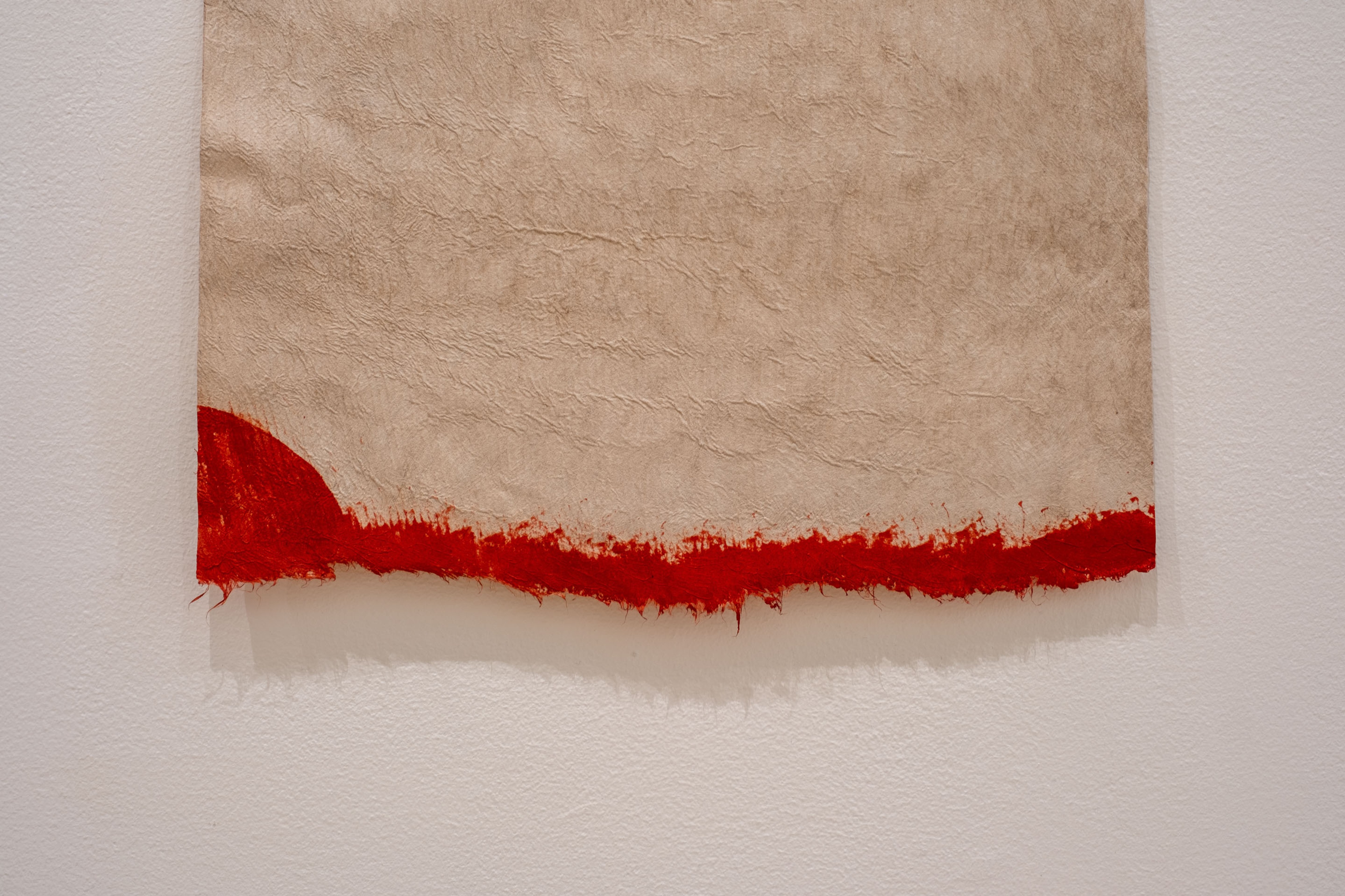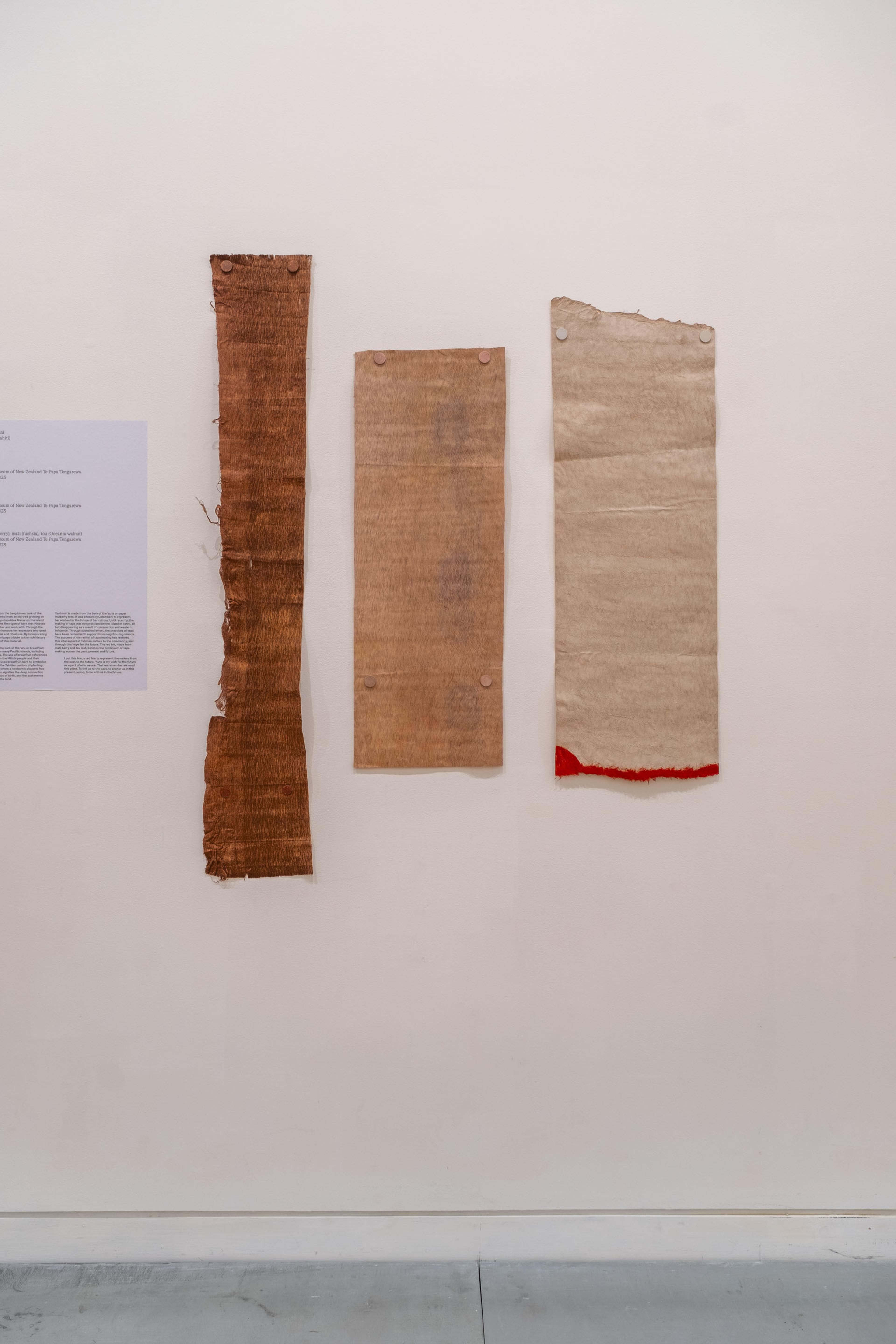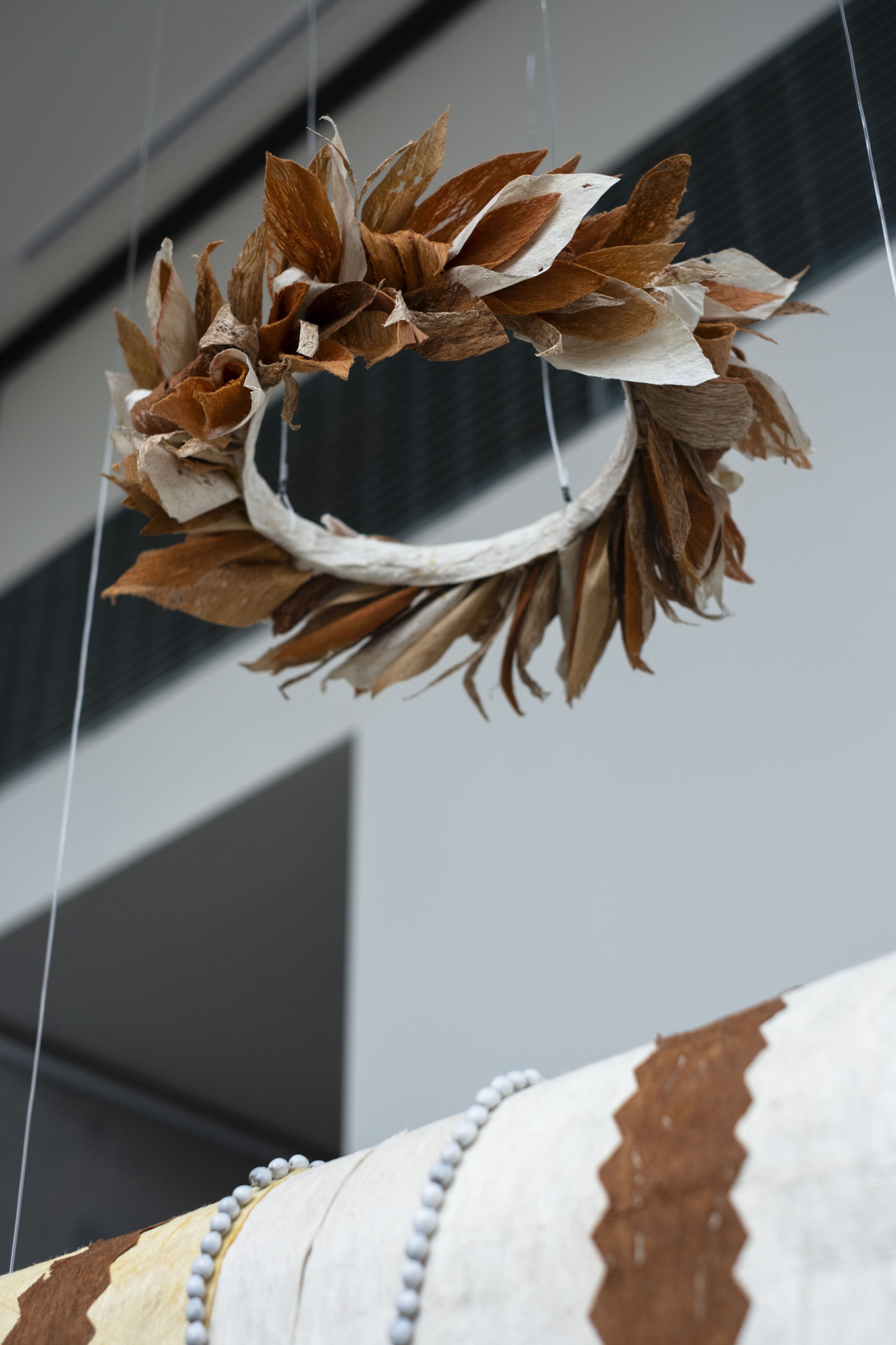 Hinatea Colombani, Tauāmuri (detail), 2023, ’aute (paper mulberry), mati (fuchsia), tou (Oceania walnut). Collection of Museum of New Zealand Te Papa Tongarewa. Commissioned 2023. Installation view, ’Ahu: Ngā Wairua o Hina, Vaiei Tupuna, Te Pātaka Toi Adam Art Gallery, Te Herenga Waka—Victoria University of Wellington, 2024. Photo: Ted Whitaker.