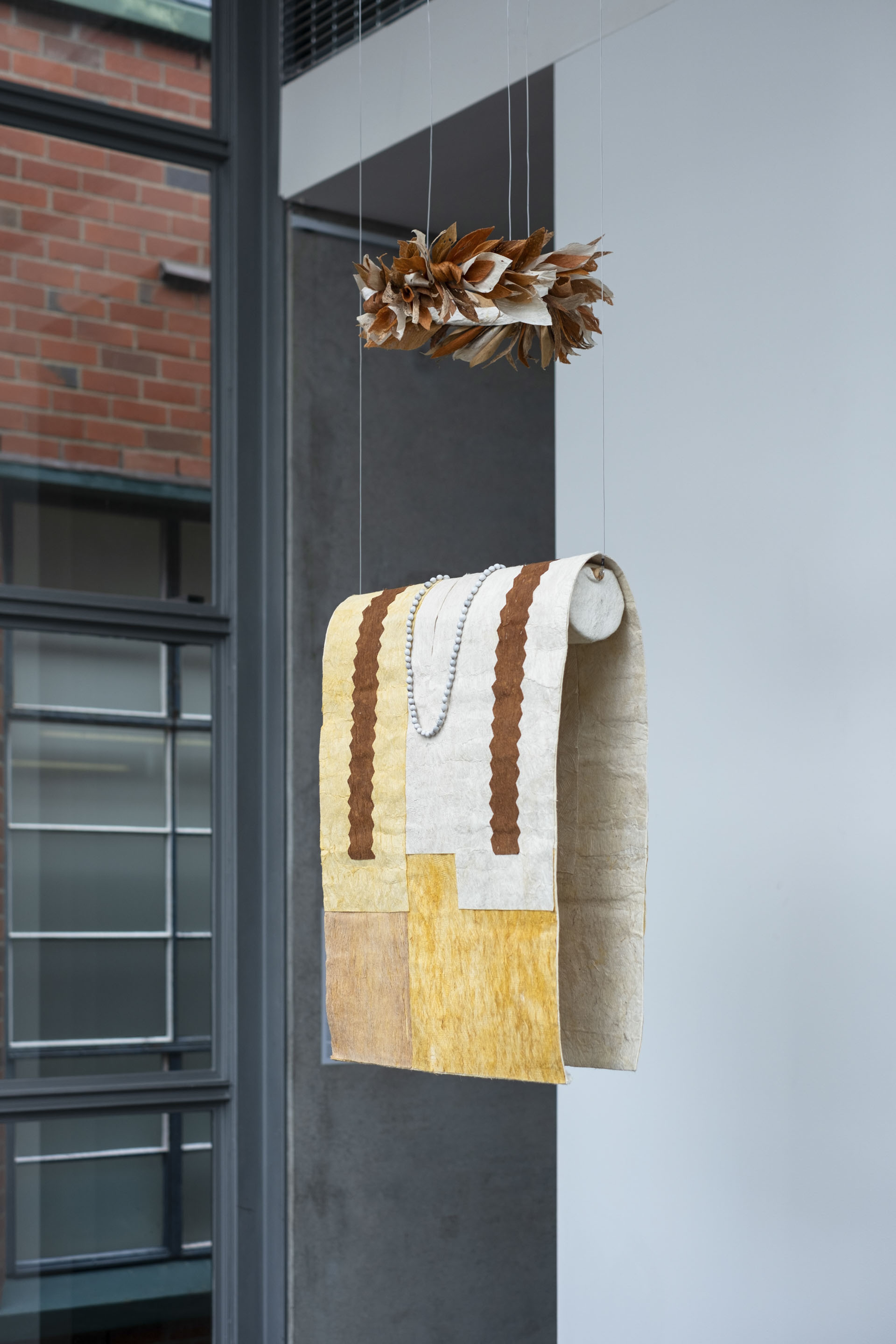 Pauline Reynolds, Te hei no Hina (detail), 2024, woven and plaited ’ōrā (banyan); and My Grandmother is a Tīputa, 2022, aute (paper mulberry), ’uru (breadfruit), ’ōrā tapa dyed with turmeric and nono. Courtesy of the artist. Installation view, Hina Sings, Vaiei Tupuna, Te Pātaka Toi Adam Art Gallery, Te Herenga Waka—Victoria University of Wellington, 2024. Photo: Ted Whitaker.