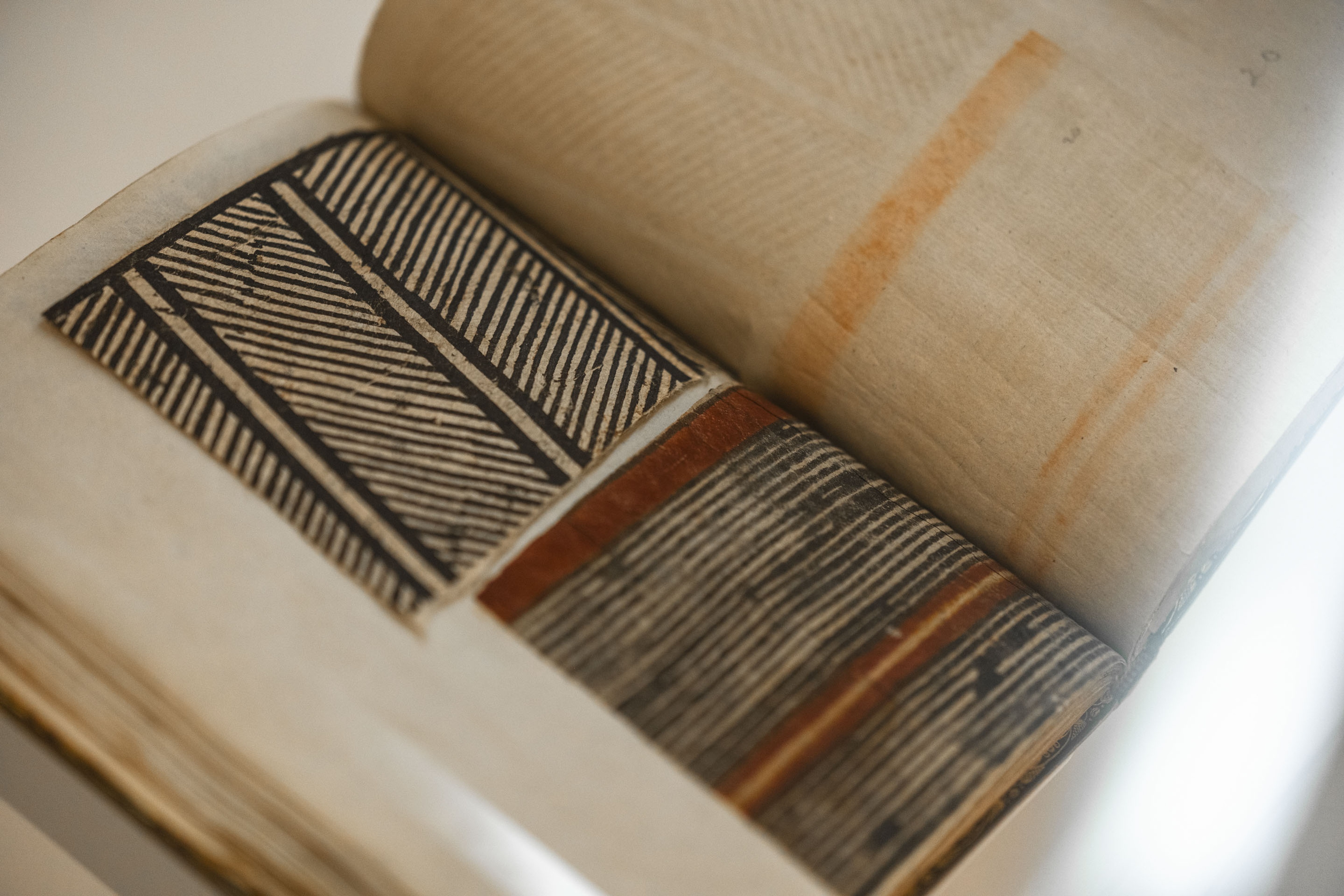 Alexander Shaw, A catalogue of the different specimens of cloth collected in the three voyages of Captain Cook, to the southern hemisphere: with a particular account of the manner of manufacturing the same in the various islands of the south seas ; partly extracted from Mr. Anderson and Reinhold Forster’s observations, and the verbal account of some of the most knowing of the navigators : with some anecdotes that happened to them among the natives. (detail),1787, 8 p., [24 ] leaves of cloth samples. Collection of the Alexander Turnbull Library, Te Puna Mātauranga o Aotearoa National Library of New Zealand. Installation view, ’Ahu: Ngā Wairua o Hina, Vaiei Tupuna, Te Pātaka Toi Adam Art Gallery, Te Herenga Waka—Victoria University of Wellington, 2024. Photo: Ted Whitaker.