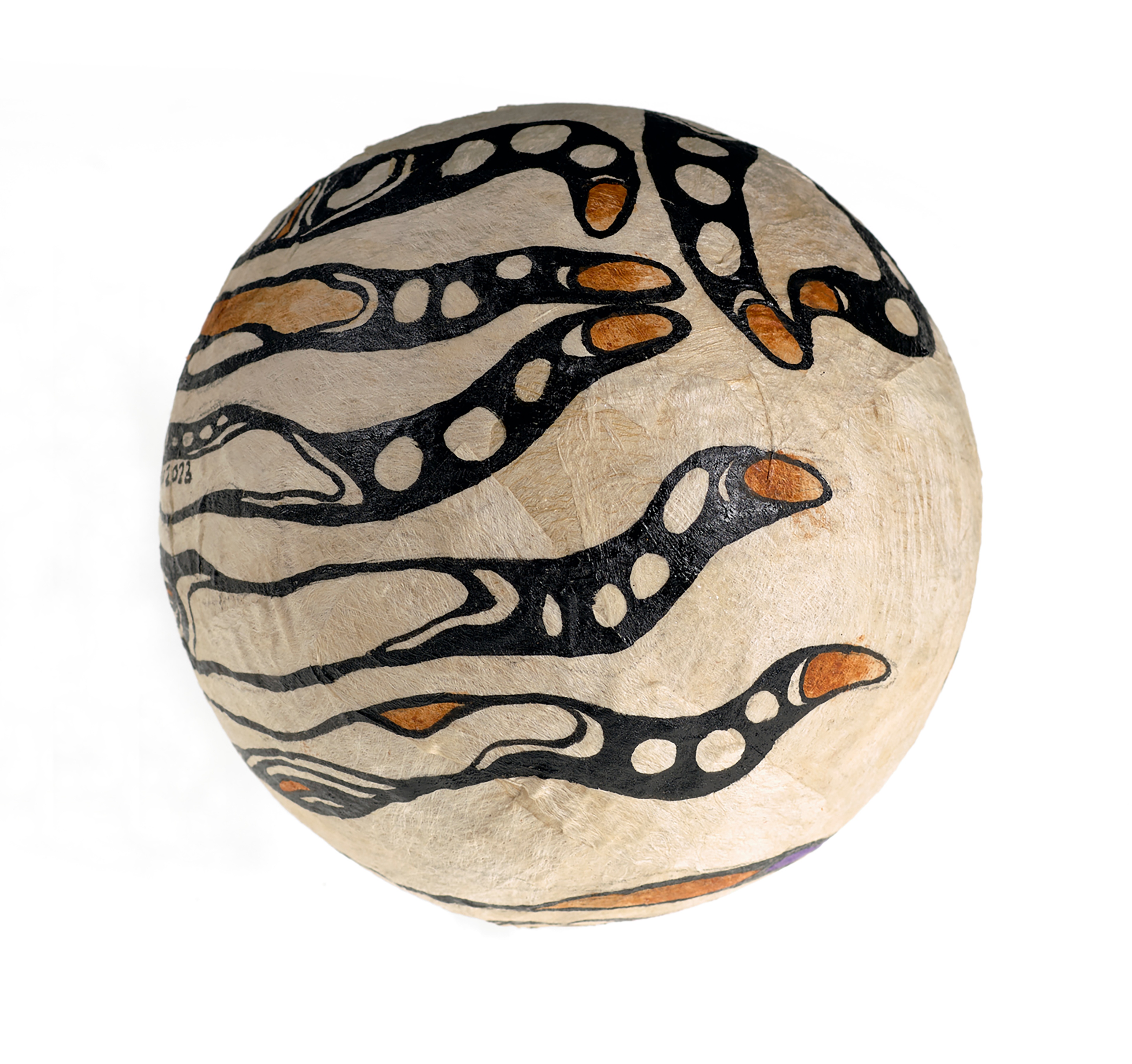 Tui Emma Gillies, Feke, 2023, mixed media and natural pigment on ngatu sphere, Collection of Museum of New Zealand Te Papa Tongarewa, commissioned 2023.