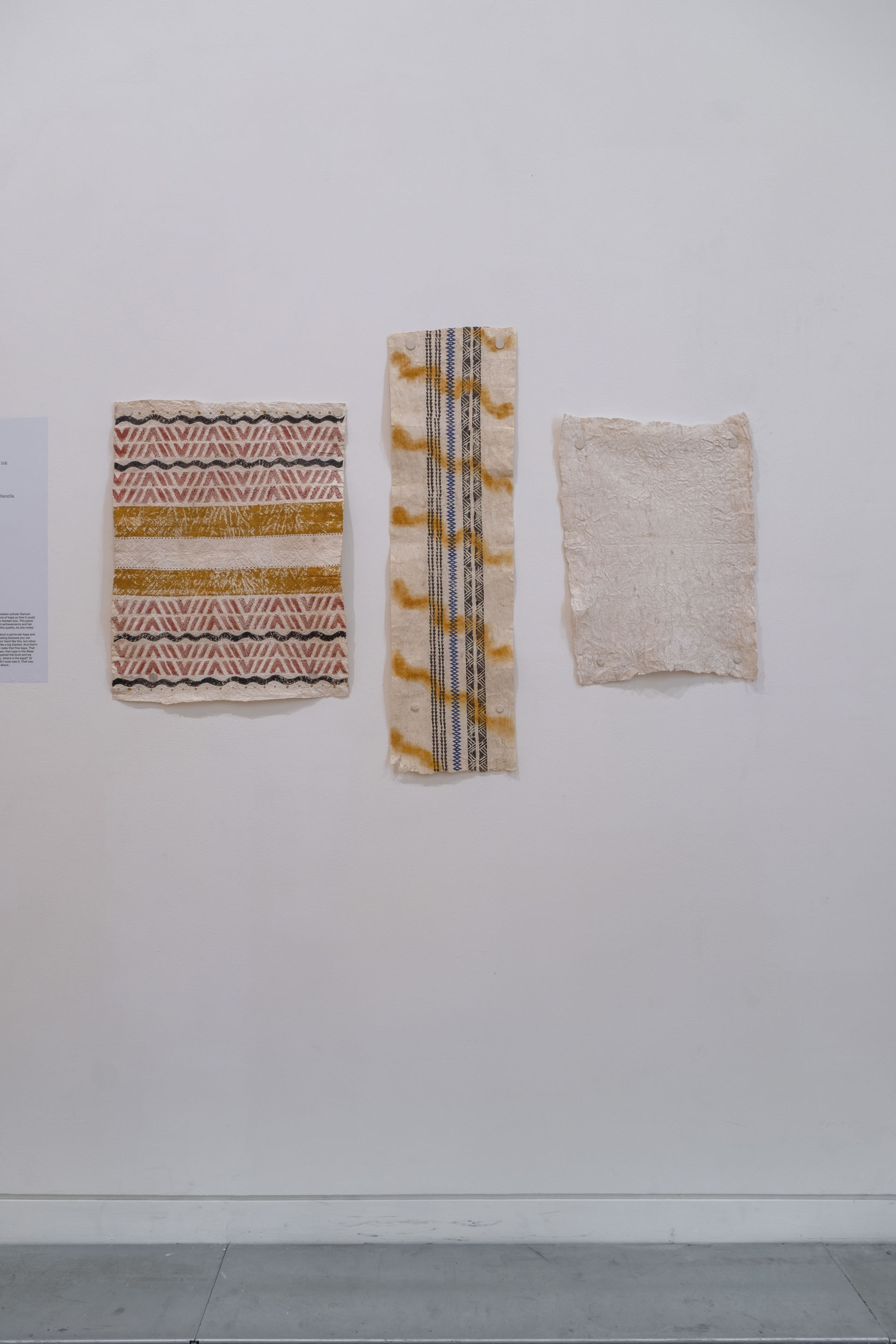 Alexander Shaw, [Catalogue of the Different Specimens of Cloth Collected in the three Voyages of Captain Cook], 1787, tapa cloth, paper. Collection of Museum of New Zealand Te Papa Tongarewa. Gift of the Te Papa Foundation 2021. Purchased with Charles Disney Art Trust funds. Installation view, ’Ahu: Ngā Wairua o Hina, Vaiei Tupuna, Te Pātaka Toi Adam Art Gallery, Te Herenga Waka—Victoria University of Wellington, 2024. Photo: Ted Whitaker.