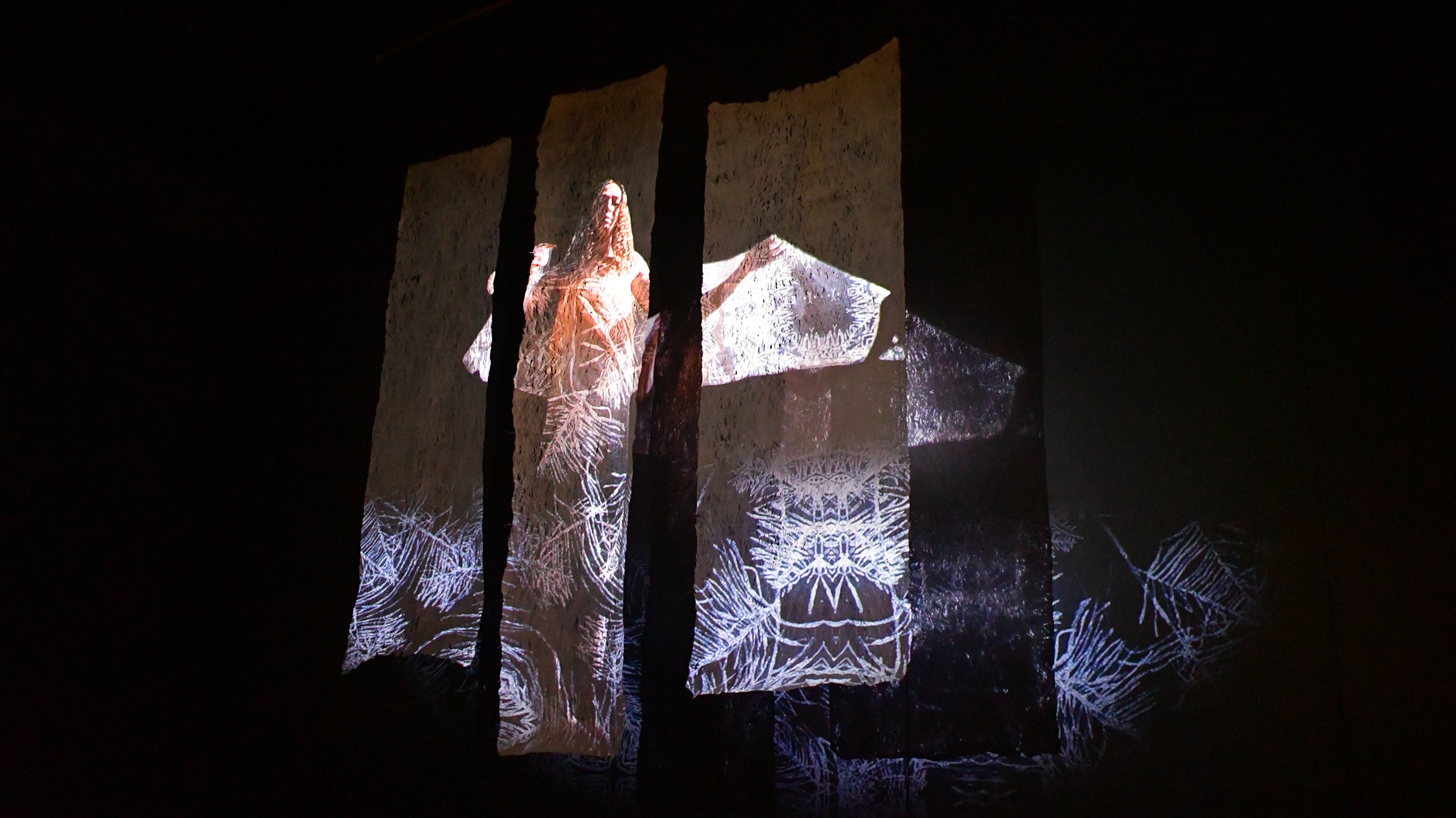 Pauline Reynolds and Sue Pearson, Hina’s Granddaughters, 2022, HD video with audio projected onto tapa cloth, 10 minutes, looped, Courtesy of the artists.