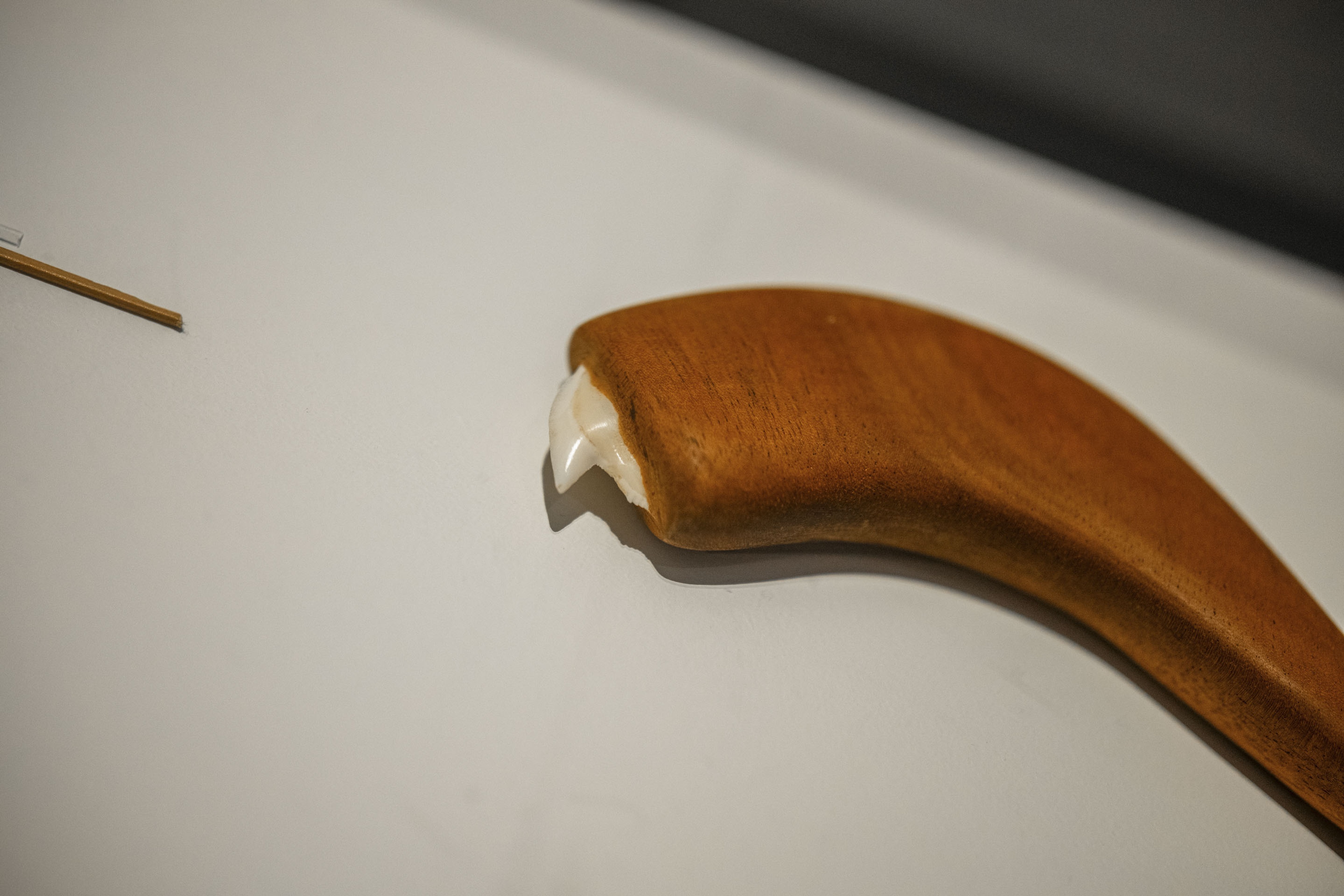 Dalani Tanahy, Niho mano (shark knife) (detail), 2021, Niho mano (tiger shark tooth), ohi‘a wood, 40 × 150 × 20mm. Collection of Museum of New Zealand Te Papa Tongarewa. Purchased 2022. Installation view, ’Ahu: Ngā Wairua o Hina, Vaiei Tupuna, Te Pātaka Toi Adam Art Gallery, Te Herenga Waka—Victoria University of Wellington, 2024. Photo: Ted Whitaker.