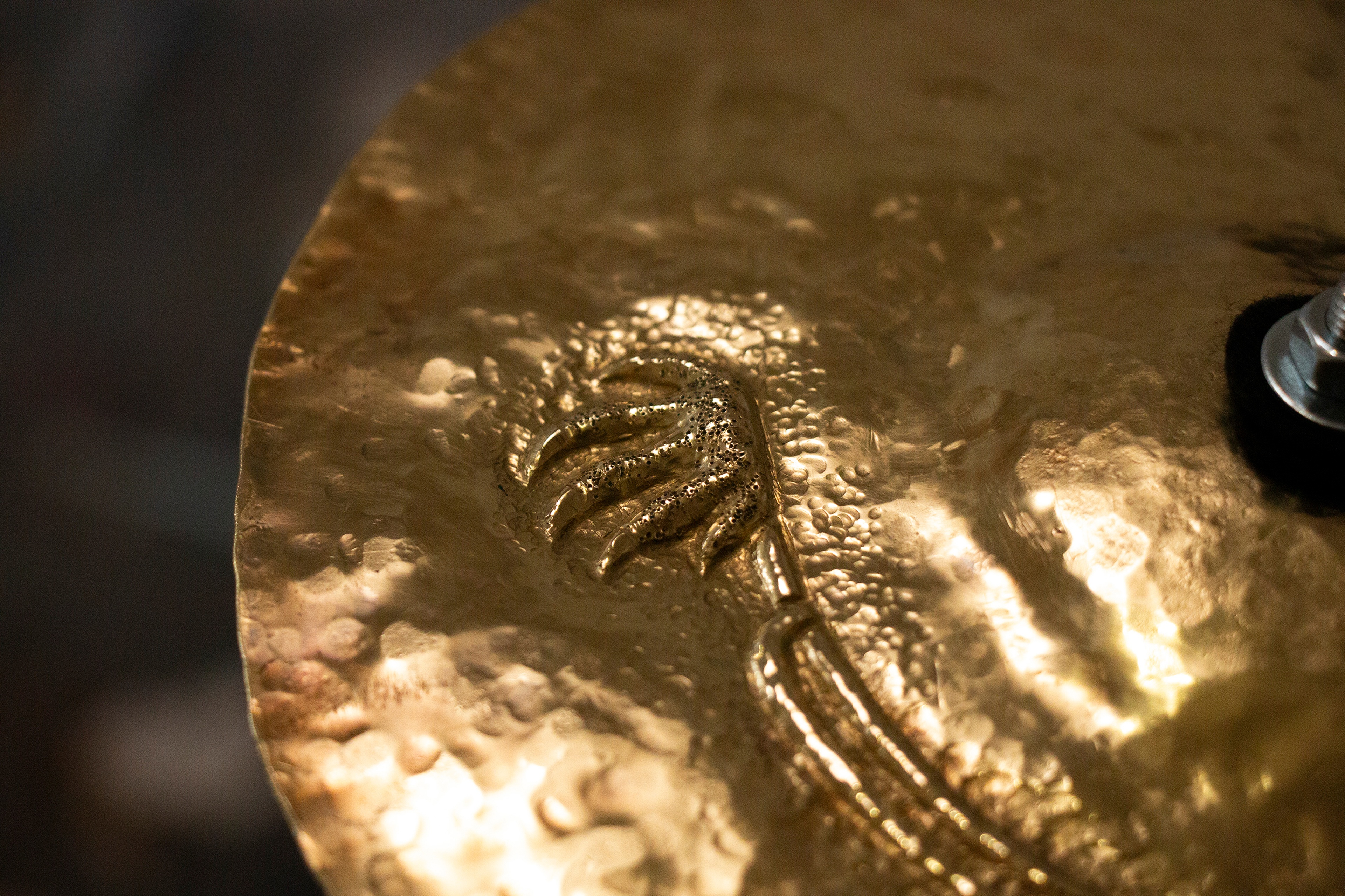 Madison Kelly, Heed a tohu, cradle a branch (detail), 2025, brass, steel, felt, mallets, drumsticks, harakeke, cord, dimensions variable. Image courtesy of the artist.